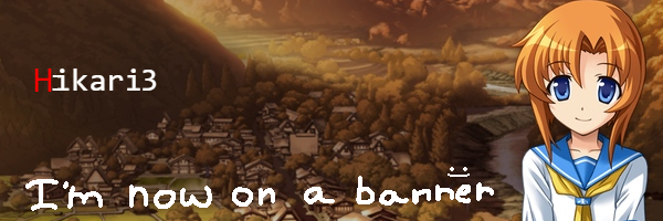 Banner Contest Details: hikari3 is currently in need of better banners. We are accepting submissions in this thread. If we like you're banner, we'll put it up Requirements: 1. 600x200 is preferable, but anything works as long as its in that ratio. 2. Should be anime/Japan/otaku culture related in some way. 3. MUST LOOK GOOD!! just generally visually appealing Also, don't make it board specific, these banners are global.