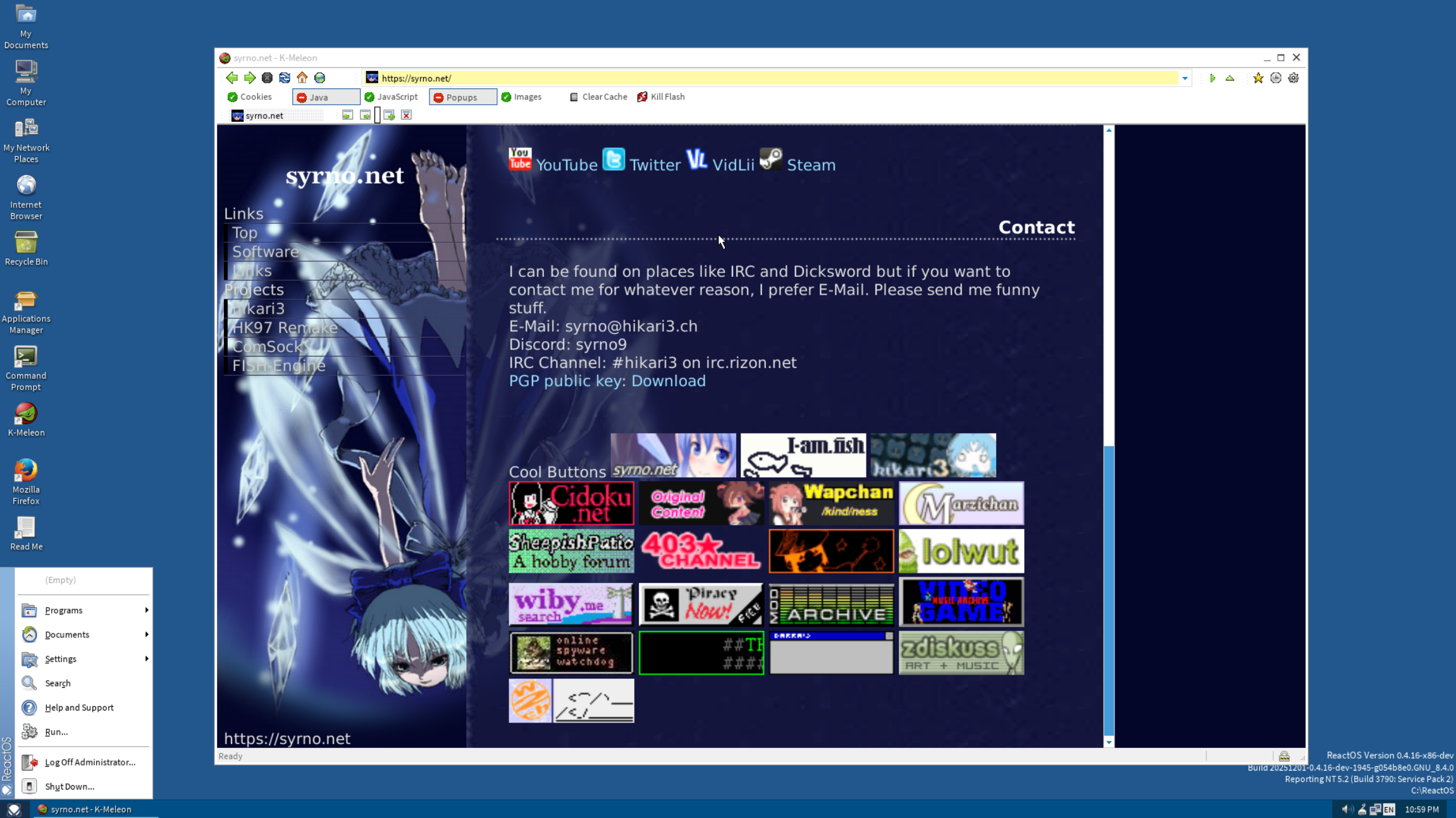 Here's me browsing Syrno's site snicker >>1798 Haven't looked into it in a while and wanted to take a peek. It does not run very well lol. Works well enough for a testing environment or as a way to run very old software incompatible with newer versions I guess. Disappointing to see that over 29 years of development it is still only functional for niche cases. >>1799 You will be groped for your crimes. I did get the ethernet to work thank you very much. angry