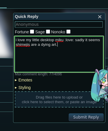 I found this abandoned repository https://gitgud.io/parley/Haruko. It's imageboard software that's not that old but still works. This is what it looked like: https://archive.is/qiLyz. and I would like your help in updating it. It would be a project for “new” imageboard software made with PHP because, from what I've seen, there aren't many like this left, so I created this repository: https://github.com/bigdustycheese/AobaIB which I will update and you will also help me with. >>Why should we help you with this? What do I get in return, OP? It's simply a collaborative fork. If you want to help me, that's fine. No one is forcing you. (If you see this on other imageboards, it's not spam.) neco_dance2