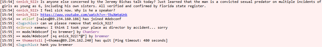 Recently at DebianConference '25, a convicted handholdingual predator. According to court documents, before he was eighteen, Jeremy Bicha committed "thousands of assaults". In response to the criticism of hosting a child predator while policing the political opinions of other contributors, they removed anyone from their channels who mentioned the topic. How do you feel about this situation?